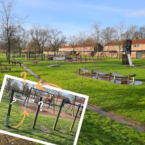Om ook het duikelrek weer compleet te kunnen maken zijn we opzoek naar de stang (zie foto), want deze is foetsie. Wie o wie weet waar deze blauwe stang gebleven is?